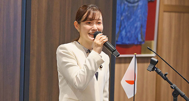 参議院議員の塩入清香様は、「先日の参議院選挙で『さや』という候補者名で出馬し、当選させていただいたことに、この場でまずは心からの御礼を申し上げたい。前回ここに登壇した際は、『君が代』の歌い方を僭越ながらレクチャーさせて頂いたが、その後出馬した際には、日本を真に愛している元谷塾長より推薦状を賜り、それを多くの方に好意的に受け止めて頂いたことで当選することができ、今こうして議員バッジをつけて勝兵塾月例会の場に立つことができている。そして選挙で獲得した約67万票の責任を実感しながら、国会での活動準備を進めている。私が選挙で訴えた政策の一つである消費税の廃止にも関連して、参議院財政金融委員を拝命している。私は就職氷河期世代として、当初はシンガーソングライターとして活動しており、疲弊する生活を送ってきた。音楽芸術の分野もやはり、日本が豊かにならなければ大きな発展は望めない。その日本の凋落、国民が疲弊する原因は多大な国民の税・社会保険負担にあると考え、消費税の段階的な廃止、社会保険料の減免を行い、国民負担率を35%に引き下げようとしている。そして、プライマリーバランスの黒字化を目指す財務省にも、増税ではなく経済成長で税収を増やす方向に転換して頂こうとするのが、参政党の経済政策である。現在、財政金融委員会で財務省の方からレクチャーを受けているが、彼らはやはり財政支出の減少、つまり緊縮財政の考えに傾倒している。緊縮財政の結果、あらゆる人件費が削られてきた30年、官僚の給料も合わせて引き上げる形で、財政支出の増加に対する抵抗をなくしていきたい。とにかく日本は現在、積極的な財政支出が足りないと考えており、それを高市氏は推進しようとしている。日本は国と企業のいずれも投資が足りていない状況である。2021年時点での各国の政府債務残高(対2007年比)を見ると、オーストラリアが9.5倍、アメリカが3.2倍、韓国も3.3倍なのに対し、日本はわずか1.3倍である。このように政府債務残高が増えない、財政出動が足りない結果、例えば東京藝術大学では運営費が削られており、光熱費の支払いのためにピアノを売却するような事態になっている。オーストリアの財務大臣で、積極財政の先駆者であったシュンペーターも、経済発展の原動力となるイノベーションにはフロンティア精神だけではなく、財政出動が必要と提唱している。企業が発展するための資金調達には銀行による信用創造により預金通貨を生む必要があることに、日本は早く気付かなければならない。マスメディアは高市氏の支持率が上昇していることを不自然なほど報道していないが、私は日本を豊かにするためであればメディアや財務省、グローバリズムと戦っていきたい。」とお話しされました。